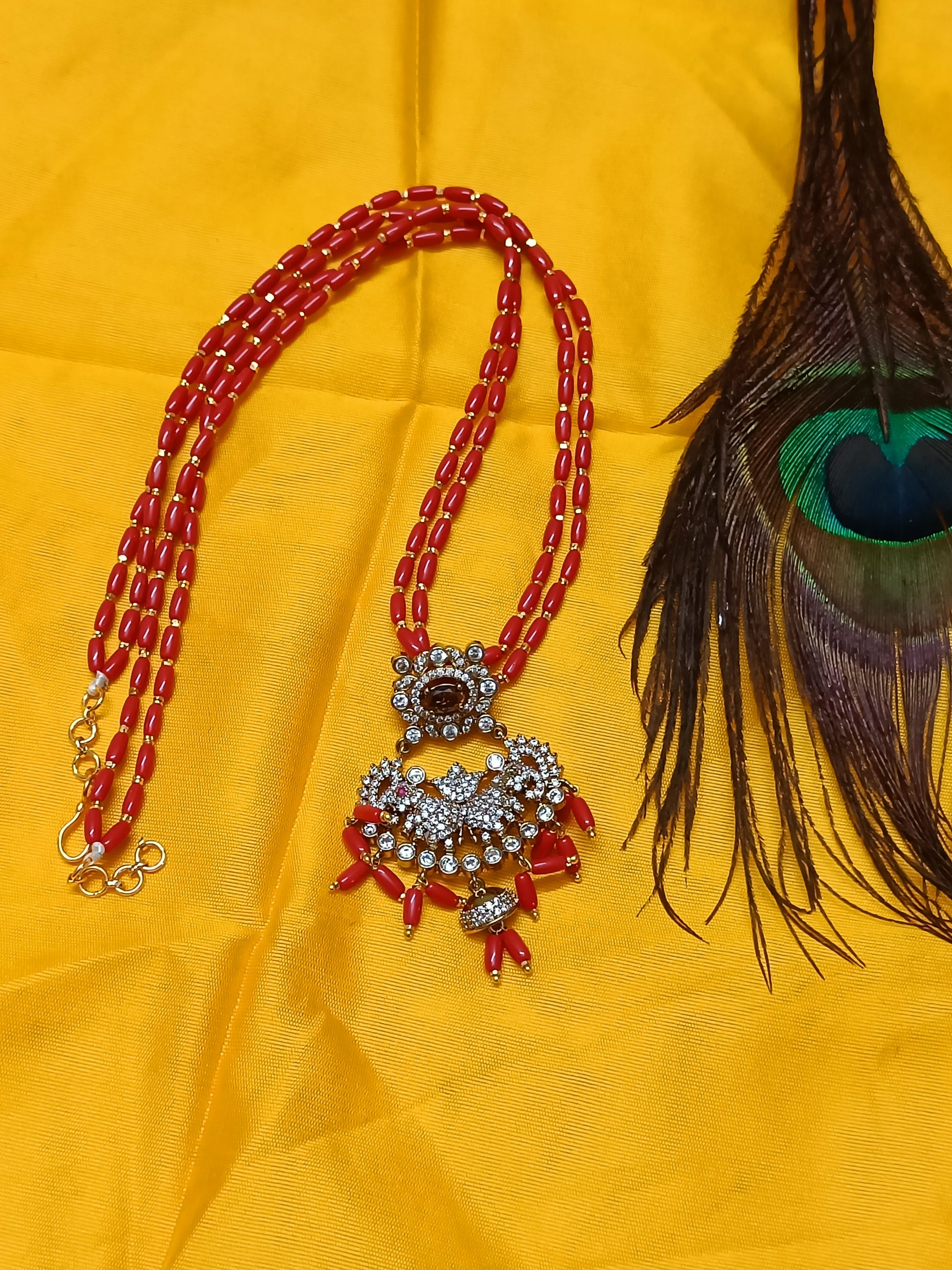 This premium necklace showcases vibrant coral beads paired with a Victorian-inspired elephant pendant, embellished with sparkling AD stones and a captivating purple gemstone.
